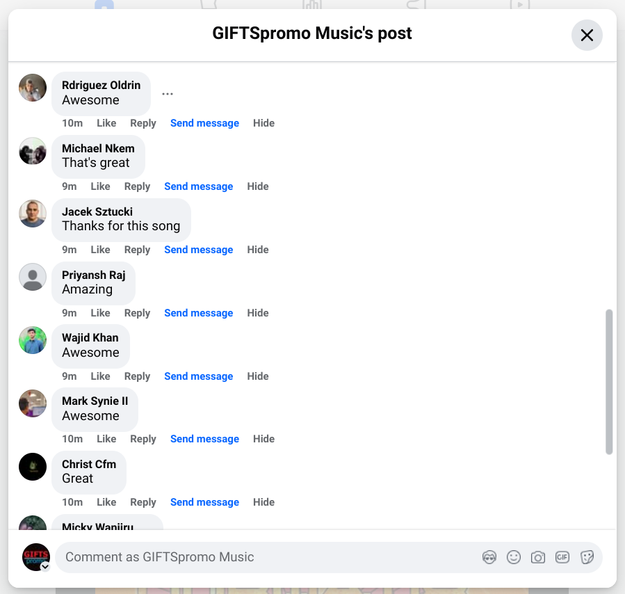 Then the comments were mainly one word or gibberish. Even the music artist being promoted questioned them! Check the attached.